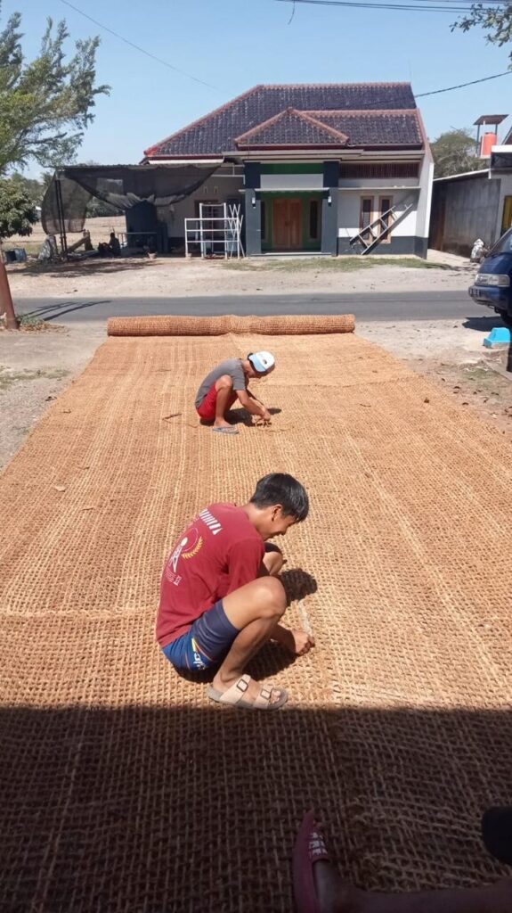 PT.Mitra Sabut Cilacap – Produksi Cocomesh di Desa Pucung Lor masih menggunakan cara manual yaitu dengan cara tali sabut kelapa dianyam memanjang sesuai ukuran yang di butuhkan. Alasan kami lebih memilih menggunakan cara manual untuk proses produksinya dibandingkan menggunakan mesin, salah satunya karena dengan cara manual kita dapat membuka lapangan pekerjaan untuk masyarakat sekitar dibandingkan menggunakan mesin yang hanya memerlukan beberapa operator saja. Untuk Kapasitas Produksi Cocomesh per Bulan mencapai 50.000m2. Walaupun kami menggunakan cara manual kami tetap menjaga kualitas mutu barang agar sesuai dengan spesifikasi dan permintaan customer.